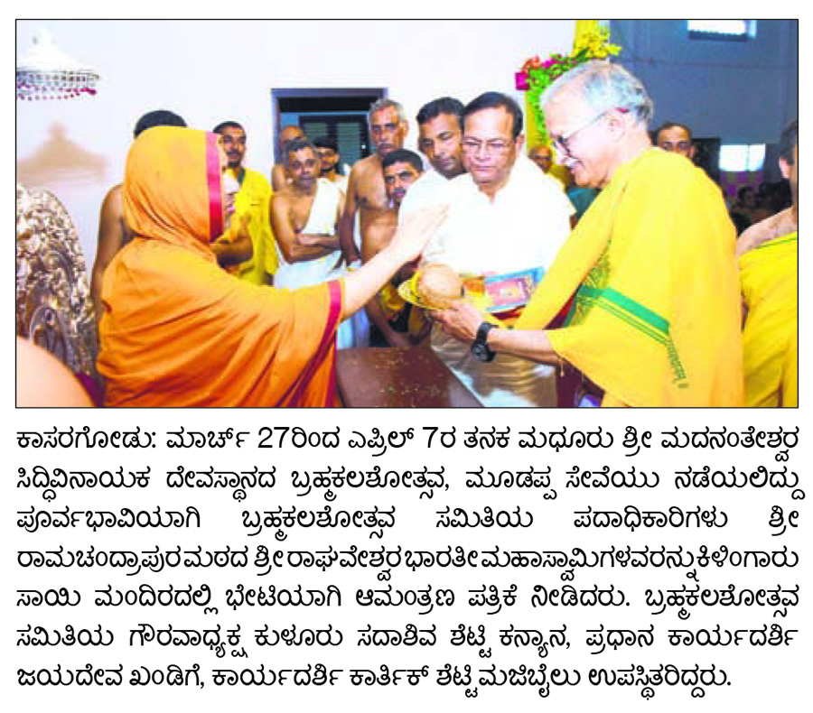ಶ್ರೀ ರಾಘವೇಶ್ವರ ಭಾರತೀ ಸ್ವಾಮೀಜಿಯವರಿಗೆ ಮಧೂರು ಕ್ಷೇತ್ರ ಬ್ರಹ್ಮಕಲಶೋತ್ಸವ ಆಮಂತ್ರಣ