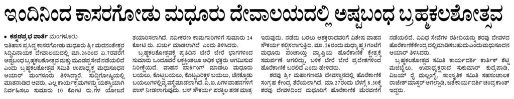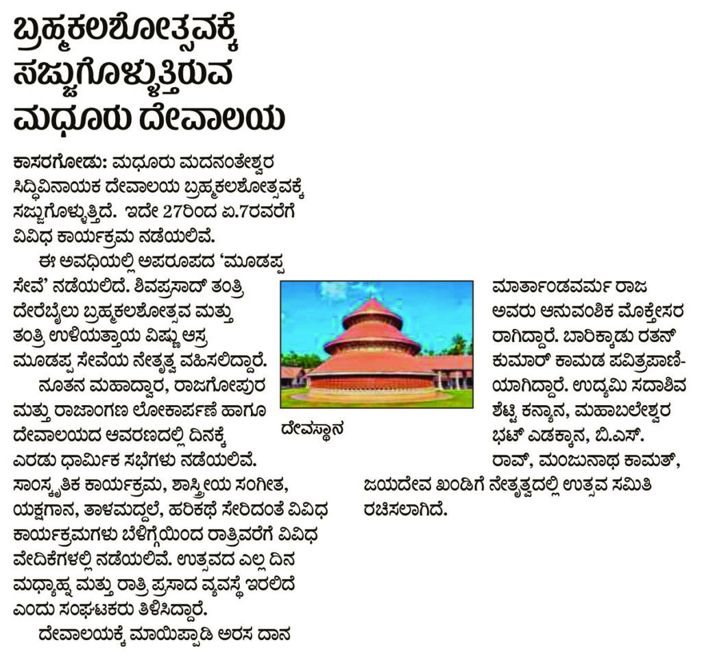 ಇಂದಿನಿಂದ ಕಾಸರಗೋಡು ಮಧೂರು ದೇವಾಲಯದಲ್ಲಿ ಅಷ್ಟಬಂಧ ಬ್ರಹ್ಮಕಲಶೋತ್ಸವ