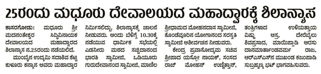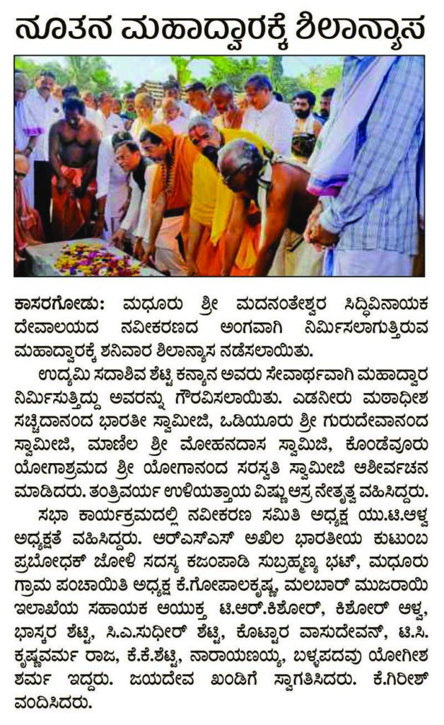 25ರಂದು ಮಧೂರು ದೇವಾಲಯದ ಮಹಾದ್ವಾರಕ್ಕೆ ಶಿಲಾನ್ಯಾಸ
