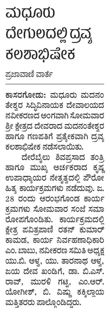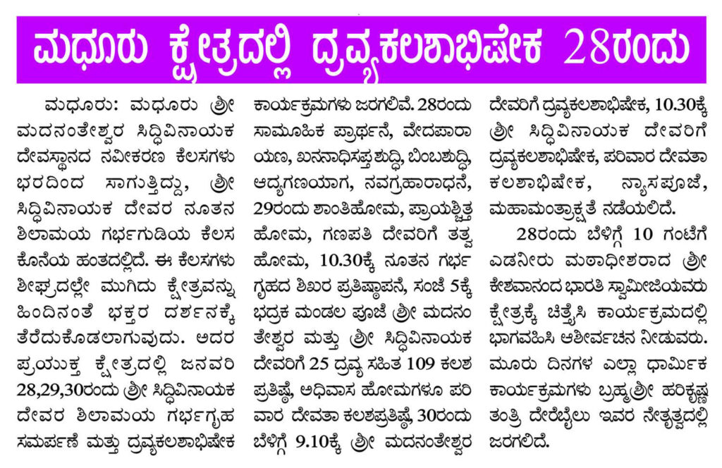 ಮಧೂರು ಕ್ಷೇತ್ರದಲ್ಲಿ ದ್ರವ್ಯ ಕಲಶಾಭಿಷೇಕ 28ರಂದು