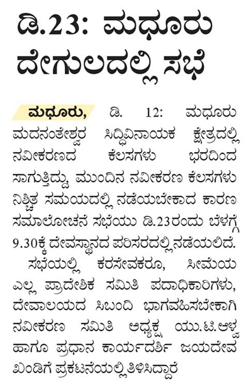ಡಿ.23: ಮಧೂರು ದೇಗುಲದಲ್ಲಿ ಸಭೆ