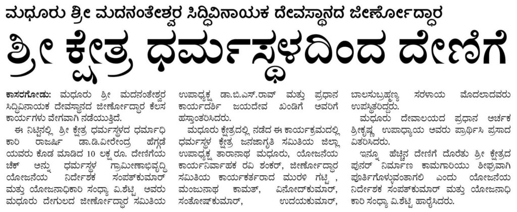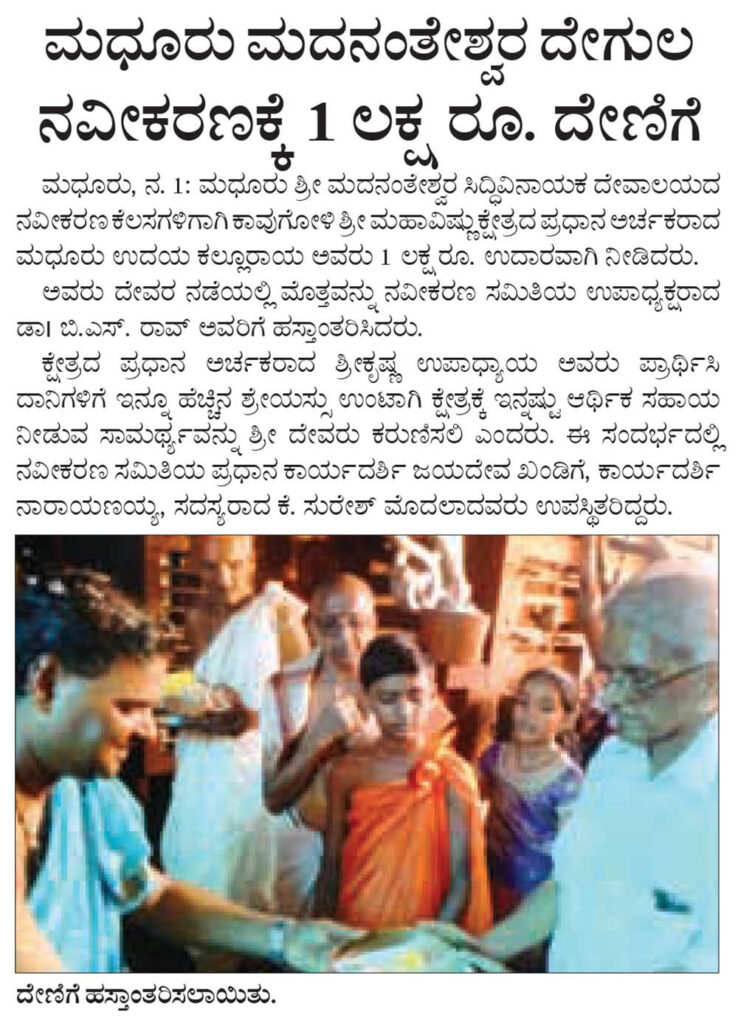ಮಧೂರು ಮದನಂತೇಶ್ವರ ದೇಗುಲ ನವೀಕರಣಕ್ಕೆ 1 ಲಕ್ಷ ರೂ. ದೇಣಿಗೆ