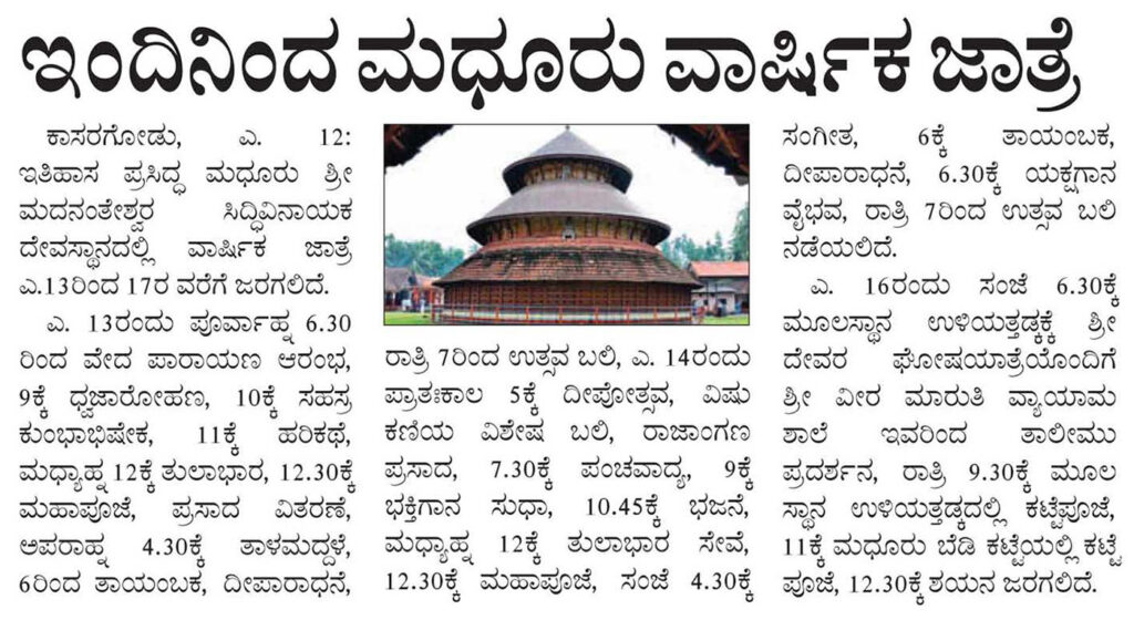 ಇಂದಿನಿಂದ ಮಧೂರು ವಾರ್ಷಿಕ ಜಾತ್ರೆ