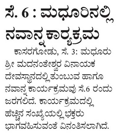 ಸೆ. 6: ಮಧೂರಿನಲ್ಲಿ ನವಾನ್ನ ಕಾರ್ಯಕ್ರಮ