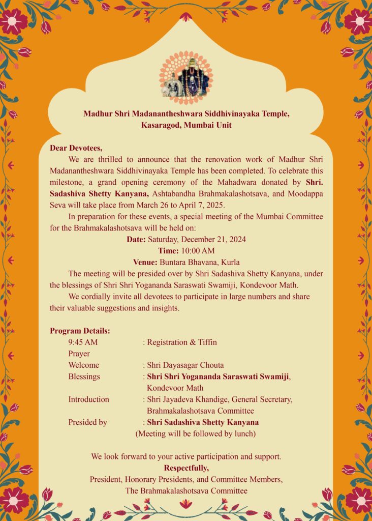 Madhur Temple Brahmakalashotsava: Mumbai Committee meeting on 21-12-2024