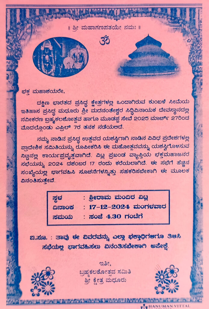 Madhur Temple Brahmakalashotsava: Vitla Committee formation meeting on 17-12-2024
