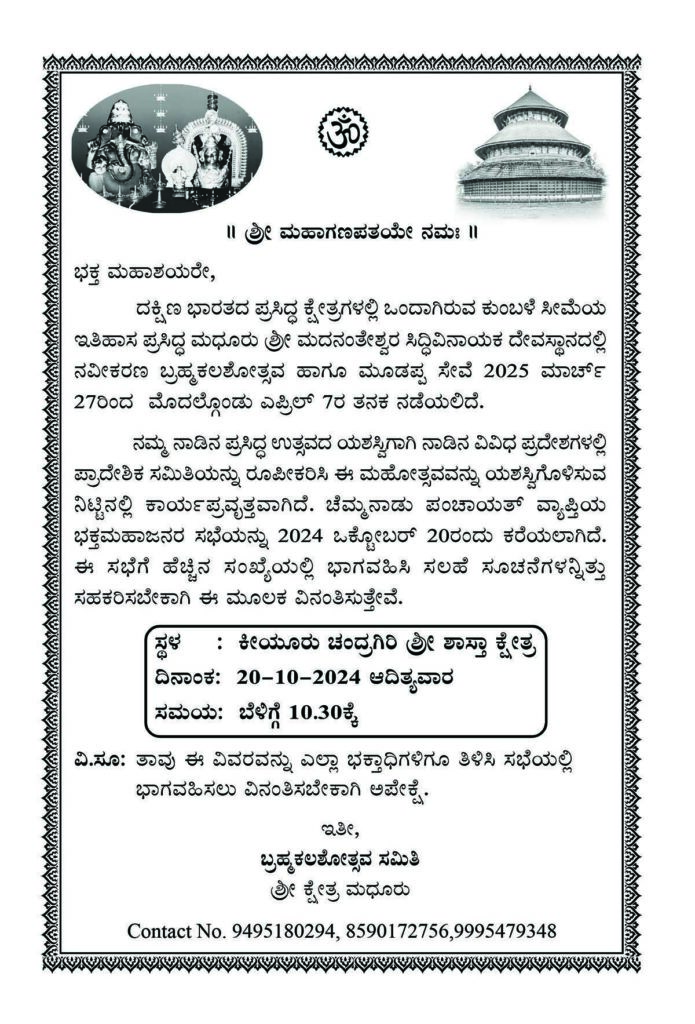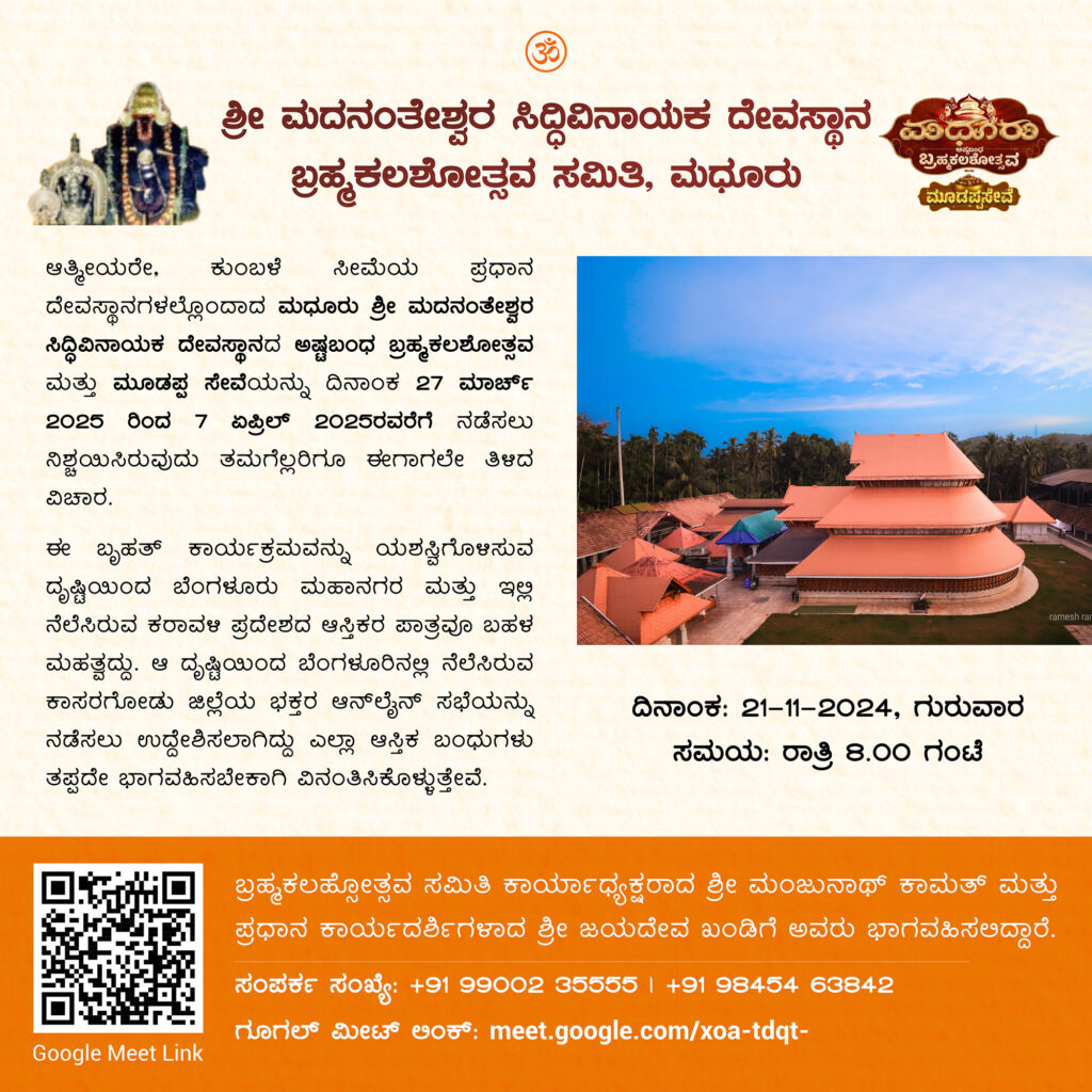 19-11-2024ಆತ್ಮೀಯರೇ, ಕುಂಬಳೆ ಸೀಮೆಯ ಪ್ರಧಾನ ದೇವಸ್ಥಾನಗಳಲ್ಲೊಂದಾದ ಮಧೂರು ಶ್ರೀ ಮದನಂತೇಶ್ವರ ಸಿದ್ಧಿವಿನಾಯಕ ದೇವಸ್ಥಾನದ ಅಷ್ಟಬಂಧ ಬ್ರಹ್ಮಕಲಶೋತ್ಸವ ಮತ್ತು ಮೂಡಪ್ಪ ಸೇವೆಯನ್ನು ದಿನಾಂಕ 27 ಮಾರ್ಚ್ 2025ರಿಂದ 7 ಏಪ್ರಿಲ್ 2025ರವರೆಗೆ ನಡೆಸಲು ನಿಶ್ಚಯಿಸಿರುವುದು ತಮಗೆಲ್ಲರಿಗೂ ಈಗಾಗಲೇ ತಿಳಿದ ವಿಚಾರ. ಈ ಬೃಹತ್ ಕಾರ್ಯಕ್ರಮವನ್ನು ಯಶಸ್ವಿಗೊಳಿಸುವ ದೃಷ್ಟಿಯಿಂದ ಬೆಂಗಳೂರು ಮಹಾನಗರ ಮತ್ತು ಇಲ್ಲಿ ನೆಲೆಸಿರುವ ಕರಾವಳಿ ಪ್ರದೇಶದ ಆಸ್ತಿಕರ ಪಾತ್ರವೂ ಬಹಳ ಮಹತ್ವದ್ದು. ಆ ದೃಷ್ಟಿಯಿಂದ ಬೆಂಗಳೂರಿನಲ್ಲಿ ನೆಲೆಸಿರುವ ಕಾಸರಗೋಡು ಜಿಲ್ಲೆಯ ಭಕ್ತರ ಆನ್ ಲೈನ್ ಸಭೆಯನ್ನು ನಡೆಸಲು