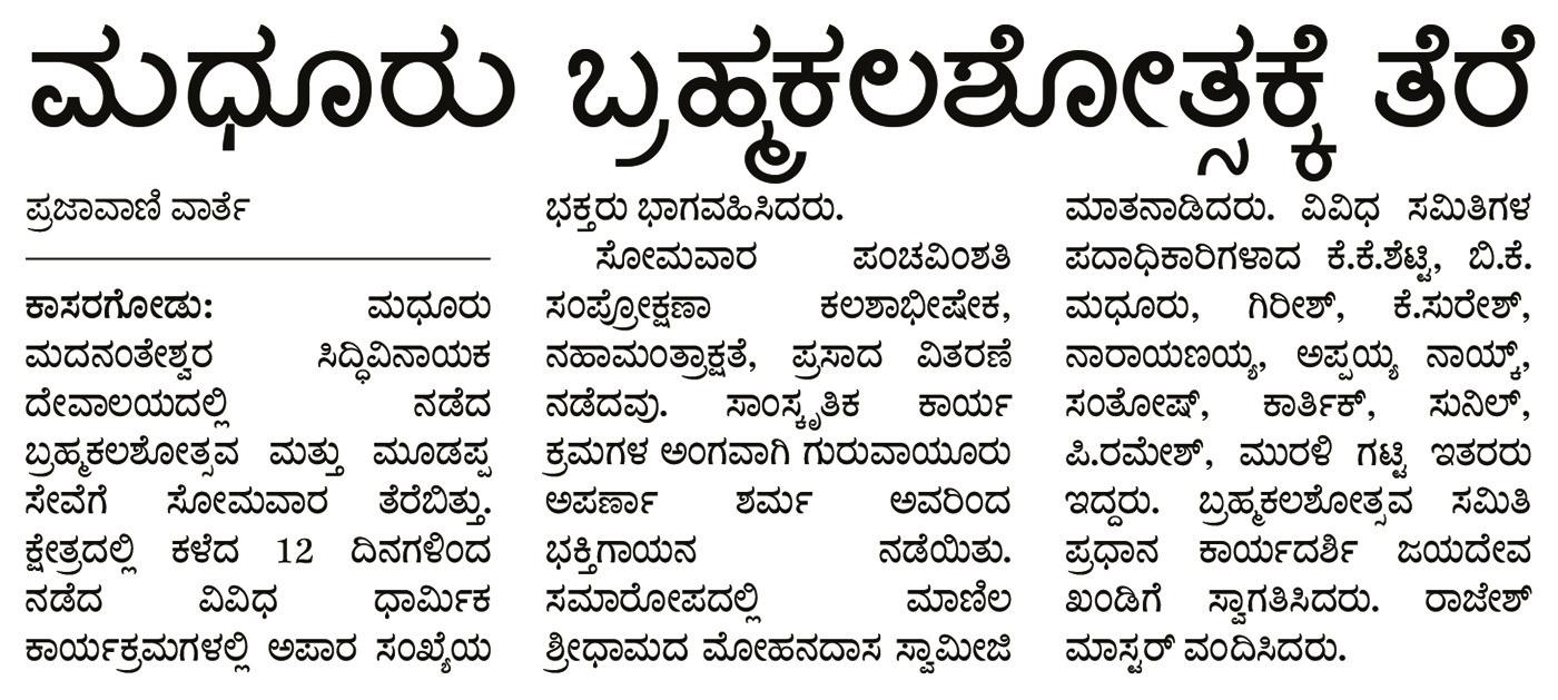 ಮಧೂರು ಬ್ರಹ್ಮಕಲಶೋತ್ಸವಕ್ಕೆ ತೆರೆ